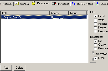 ⑴“Add”一个“Path”,选择“d:\myweb”,权限为所有都选中(特别要包括“Inherit”);再“Add”另一个“Path”,选择“d:\myweb\win98”,权限为只选“List”(列表)。