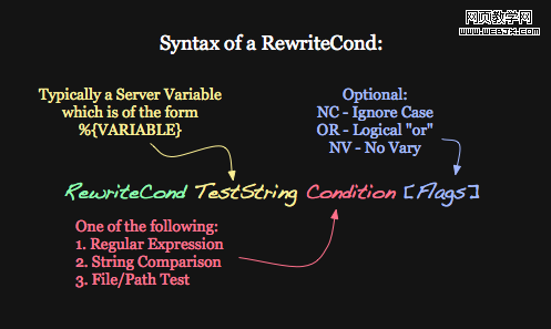 本教程不打算教你正则表达式。对于那些你知道的正则表达式,mod_rewrite中用到的正则表达式会根据Apache版本的不同而有所改变。在Apache 2.0中,他们似乎是与Perl兼容(pcre)的正则表达式。这意味着许多你所使用的简写,例如\w的意思是[A-Za-z0-9],\d的意思是[0-9],以及更多不存在的简写。但是,我的公司使用的是Apache 1.3,并且Apache1.3的正则表达式是比较有限的。