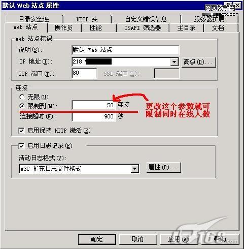 然后选择“Web站点”标签页,选择“连接”框中的“限制到”选项,然后在后面的输入框中输入你允许的最多同时在线的人数,如“50”(同图2)。设置完成后,单击“确定”按钮保存设置。重启IIS服务后你的网站就只允许50个人同时在线浏览了!
