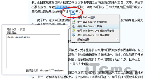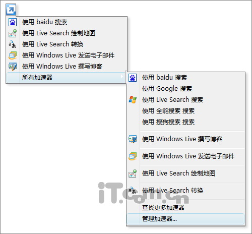 “加速器”是IE8中新增加的一项功能,其最大特点,就是能够在不离开当前页面的情况下,快速实现“地图查看”、“单词翻译”、“邮件发送”等各项常用功能。而且,它的使用也很简单,只需首先勾好待处理文字,然后点击弹出的加速器图标,接下来就可以通过鼠标悬停,快速获取到不同加速器所对应的不同结果。而且,和可视化搜索一样,我们也可以利用官方网站所提供的加速器资源库,获得更多功能支持(http://ieaddons.com/cn/accelerators/)。