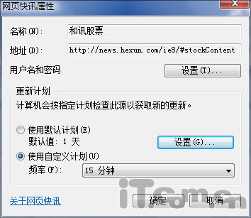 【小提示】 由于该功能需要网站建设者的支持,因此并不是所有页面都支持网页快讯。但我们却可以通过官方网站的网页快讯专区(http://ieaddons.com/cn/webslices/)进行查找。同时,也可以右击快讯按钮,自行调整当前订阅的更新频率。