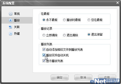 单击标题栏系统控制图标左侧的菜单图标,选择“查看”→“系统配置”(如图5),在打开窗口中单击“播放”标签,再选中“播放列表”下的“播放完毕自动关机”复选框(如图6)。以后,我们只要把播放的内容添加到播放列表中,在播放完其中的内容后就会自动关机了。