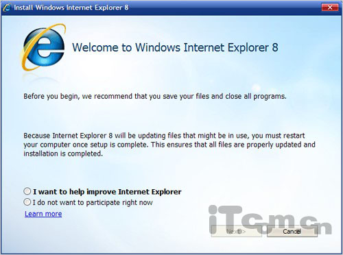 和上一版本相比,IE8 Partner build的安装包体积略有增加,为16.0 MB。界面色彩相对淡雅,看上去更加和谐。需要用户确认的选项比较少,我们只要依照提示,依次完成“用户许可协议”、“用户体验改善计划”等基础功能的设置,就可以正式开始软件的安装。