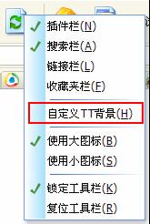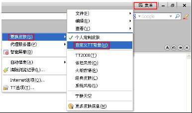 首先,打开TT浏览器后,在工具栏右键菜单或从菜单“工具->更换皮肤”中选择“自定义TT背景”,要注意的是,TT浏览器的工具按钮在不同皮肤模式下的位置也不一样,比如,在经典皮肤下工具按钮在左侧,而在TT2008皮肤下工具按钮则跑到了右侧,不过我们只要仔细看一下就可以找到了。