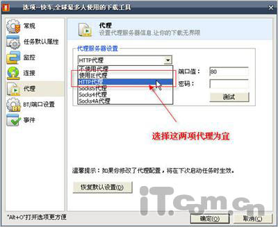 另外,如果你在公司局域网中使用BT下载,多数人都会碰到被网管限制的问题。Tracker服务器是BT下载的根源和核心,网管员自然也会注意到这一点,通过种种方法屏蔽掉这些服务器。如果遇到这种情况,不妨在快车软件中设置一个代理服务器来绕开,多数情况下都可以解决问题。不过要注意的是,在选择代理服务器类型时,最好只在IE代理和HTTP代理两种类型中选择,如图03所示。