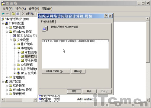 按下Win+R,输入gpedit.msc,启动“组策略”。定位到“本地计算机策略”→“计算机配置”→“Windows设置”→“安全设置”→“本地策略”→“用户权利指派”,然后双击“拒绝从网络访问这台计算机”项,将Guest用户删除掉(如图4)。