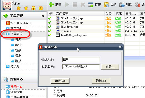 网际快车默认添加了电影、软件、视频、音乐和游戏这几个常用的类别,如果有需要,我们还可以随时添加新的分类。在网际快车主界面左侧分类窗口中,我们可以看到“下载管理”分栏下的“下载完成”节点,在其上点击鼠标右键,然后选择“新建分类”选项。接着,在弹出的对话框中输入分类名称和对应的默认目录(如图3),点击“确定”按钮即可。这样一来,以后下载文件时,我们就可以在添加下载任务窗口中选择新添加的分类了(如图4)。