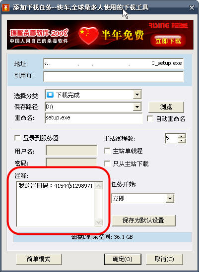 选择分类的作用和方法大家都很清楚了,那么注释呢?在添加下载任务时,点击“高级设置”按钮,然后在“注释”文本框中输入一些必要的说明信息即可(如图5)。在这里我们可以输入文件的简单描述、使用说明或是注册信息之类,免得日后使用时再次查找这些信息。