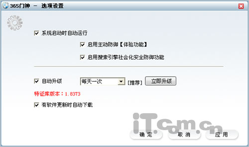 点击任务栏托盘上的365门神图标,你会发现,365门神这款软件竟然没有主界面,只有一个简单的设置界面,在这里可以进行特征库的升级,开启与关闭主动防御,以及是否启用搜索引擎社会化安全防御功能,简洁得有点让我们无法相信。主动防御是今年杀毒软件主推的功能,因此,先勾选此项。软件界面简单,我们接着看看它的实际表现如何吧!