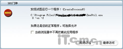 如果你不小心点选择了“继续访问”选项,有可能有的恶意网站就会发作,同时在系统中运行一些恶意程序或者脚本,但是365门神这时还在悄悄保护你。在该恶意网站企图通过浏览器进行病毒入侵的时候,365门神也会对浏览器企图运行的程序进行拦截,并且提示用户,让用户选择是否进行拦截。用户选择“拒绝访问“后,365门神会阻止该程序运行,病毒木马也就无法感染系统了,再一次保障了系统的安全。