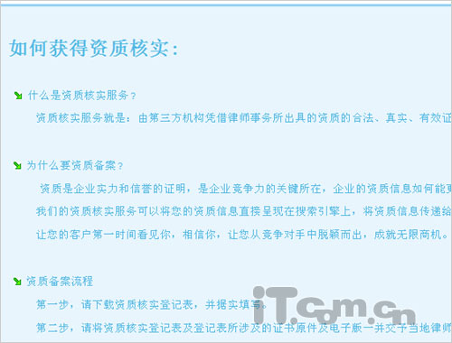在实际使用中,发现目前很多大的网站也没有通过“资质核实”,这是怎么回事呢?难道这些网站不够安全?经过仔细查看相关说明,才发现原来资质核实服务需要网站主动发起,并得到365门神的认可。具体操作是:由第三方机构凭借律师事务所出具的资质的合法、真实、有效证明,在365门神网站进行核实登记,登记后,就可以通过客户端在搜索引擎上进行提示。 而在介绍中,我们看到这样一句话,资质核实可以”让您的客户第一时间看见你,相信你,让您从竞争对手中脱颖而出,成就无限商机。”,看来又有几分商业的铜臭味了。而目前很多大网站都没有进行资质核实就不难理解了,该软件和服务刚推出不久,还没有得到各大网站的响应。