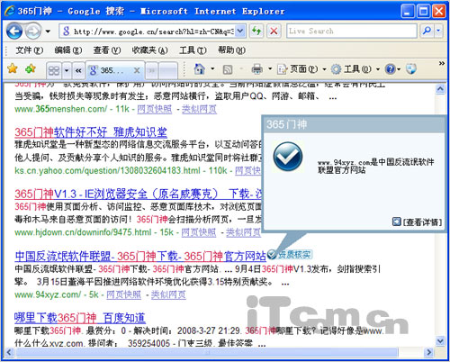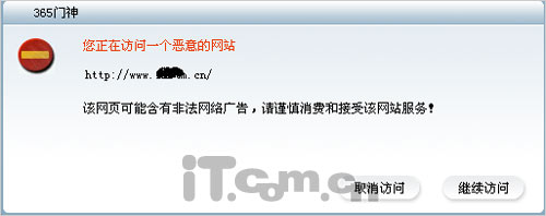 除了以上介绍的功能外,在使用过程中,我们还发现,365门神还可以屏蔽非法广告网站,打开某些广告网站也会有相关的提示: