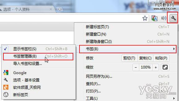 或者点击Chrome浏览器右上角的“扳手—书签—导入书签和设置”。