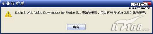 硕思网页视频下载器支持Firefox 1.5以上版本,不过Firefox每一次重大升级都会“枪毙”一大批原有的插件,不幸的是,本扩展也被识别为不兼容插件,如图1。