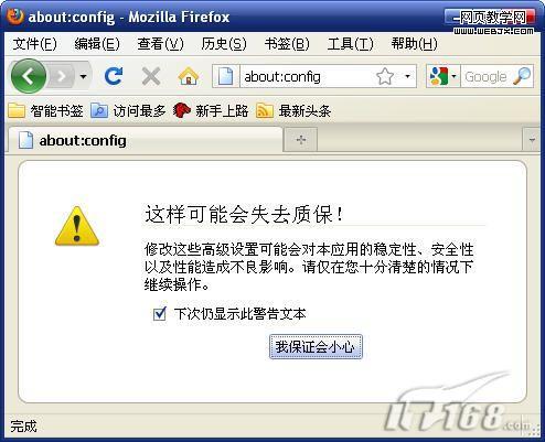 在Firefox浏览器地址栏中键入“about:config”,用户可以看到如图2的警告提示,点击“我保证会小心”按钮进入。