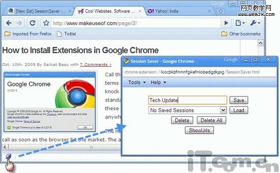 Firefox用户对Session一定不陌生吧,Session就是一系列的打开状态的Tab,用户可以保存、管理Session,以实现快速打开一系列网站的目的。Chrome Plugins网站用户twinsen发布了他制作的Session Saver插件,可以让Chrome也实现类似的功能。
