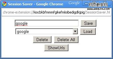 点击图标,会弹出扩展窗口,在这个窗口的第一行输入名称点击save可以保存当前的所有tab为一个Session。在下拉框中选择某个Session点击load即可载入以前保存的session。Delete / Delete All很明白,删除 / 删除所有保存的Session。ShowUrls可以查看某个Session中保存的tab URL。