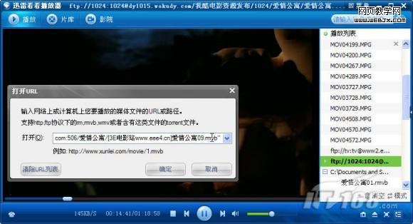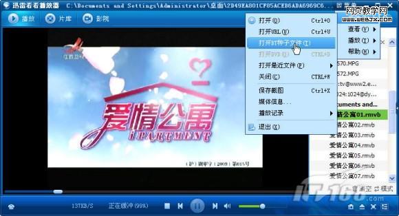 迅雷看看播放器新版本支持互联网视频播放功能,只要直接输入其URL地址即可(如图1)。同时,还可以直接打开视频文件的种子,如果种子文件中包含有多个视频文件,则会自动将其中的视频添加到播放列表中,默认播放第一个视频(如图2)。