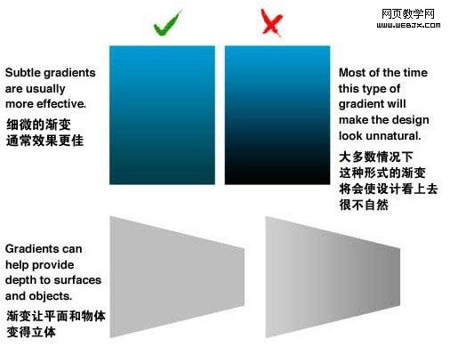 渐变的关键点是不要太过生硬。如果你使用Photoshop,可在图层样式中添加渐变。你可以随意的设置渐变的起始点;如果你改变了元素的大小,那么渐变也将重新调整。