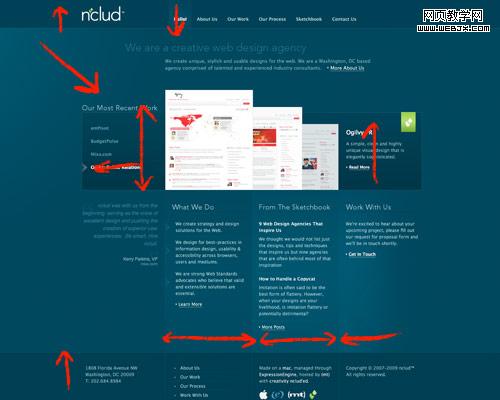 nclud’s website 是渐变运用的经典教案,它告诉我们即使细微的渐变也可以在分割和组织内容版面上取得非常好效果的。