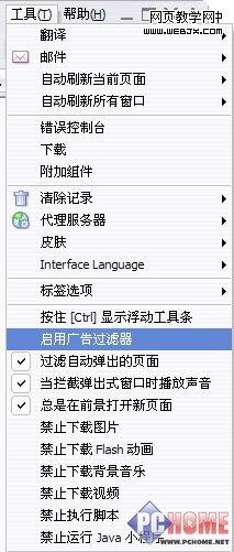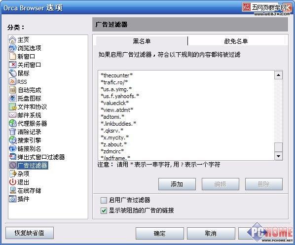 小提示:Orca Browser内建自动弹出式广告过滤器,我们可以依次点击“工具”--“Orca Browser选项”,打开图5所示的对话框进行简单的设置,这样即可非常容易地自动清除不需要的广告横幅和弹出页面,让整个网络世界清爽起来。