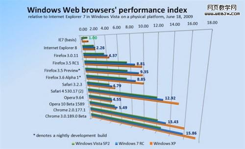 Google Chrome 3 build 189.0在Windows XP系统中的得分为17.50,毫无争议地拍在了最前面,Vista系统中Chrome 3速度是最慢的。而Safari 4现在XP系统中的速度得分也已经降至了15.04,远低于Chrome 3。