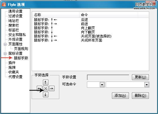 如果所示,你先单击添加按钮,然后选择鼠标手势,注意 黑色箭头指向的"X"按钮是删除选择的鼠标手势的功能。