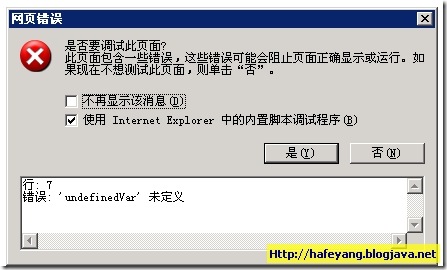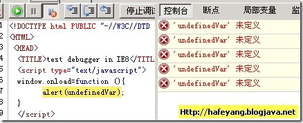还记得以前我们常用alert调试脚本的日子么,忘了他吧,IE8可以直接在代码中敲debugger;了,以前的版本我发现的调试工具当然是visual studio 了,也非常好用,不过体积非常大,装上vs 去调试javascript无疑是大材小用。还好我有.net情节。修改刚才的那个页面: