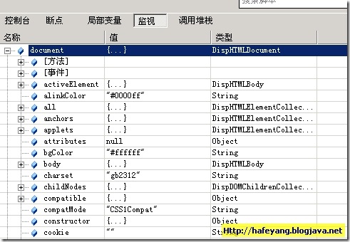 还可以添加监视,监视的内容很多,体现了很多IE特性。下面的截图是我监视document的结果: