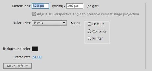 打开Flash创建一个新文档,舞台大小设为320*190,颜色为#181818 ,帧频为 24fps.