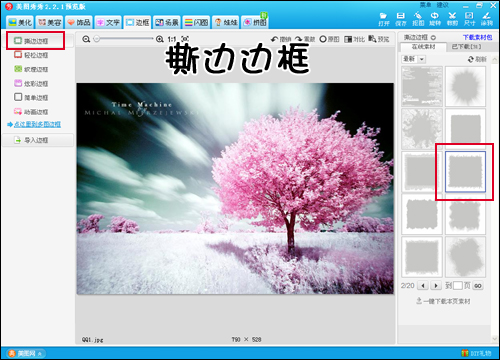 1.先来一个最简单最小白的操作,选择美图秀秀的“边框”菜单下的“撕边边框”,在右侧的素材库中选择一个喜欢的效果。