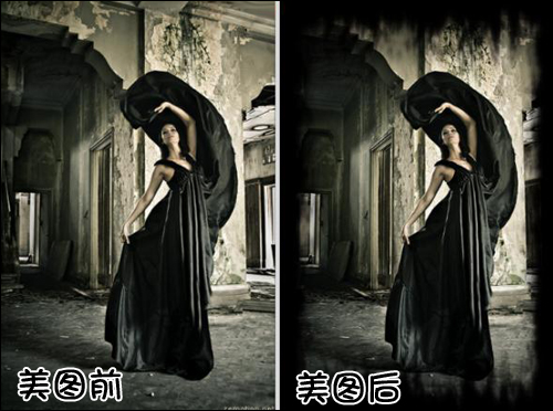 3.再来点复杂点的。“撕边边框” 默认的颜色是白色,但在左侧的“色彩库”里可以调整边框的不同颜色。对于暗色调的图来说,使用白色会起到很大的冲突,很不合适,而选择相应的黑色调就很自然的融图成功,相对于原图,这样更具有“哥特”风格!