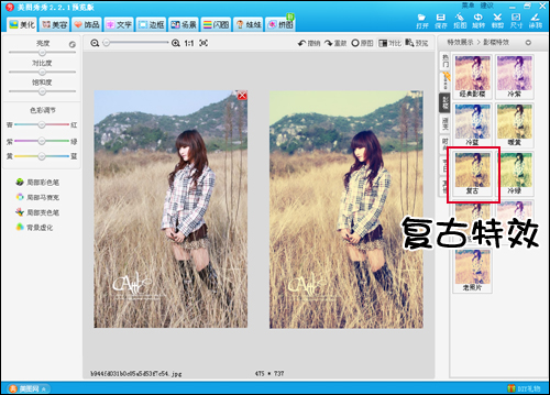 4.再来点更深入的,先在原图的基础上加些特效试试。小编尝试的是“复古”特效,看上去是旧旧的的感觉。