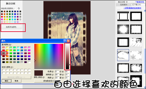 5.还是老样子选择喜欢的边框素材和颜色,小编没有用默认的色块,而是点击“选择其他颜色”,这也是美图秀秀为了方便大家不同需求而设计,任何颜色都可选。小编先选择了一个“咖啡”色块,色彩有点僵硬,可以涌过右侧的色带来调节明暗,向下加深黑色就变成了现在看到的深咖啡色,还可以直接选择颜色数值哦!
