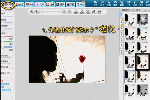 4、然后将图片整体色彩调一下,为了打造更酷的复古效果。我们采用“暖化”和“LOMO复古”的效果叠加。