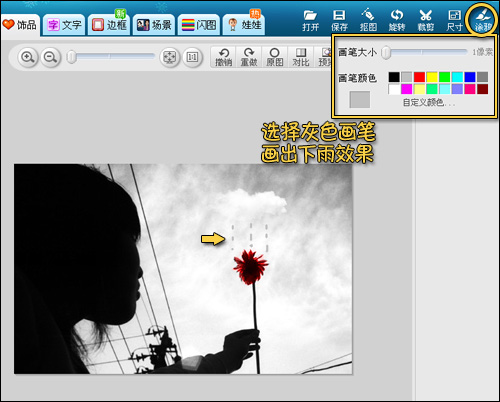 1、在“图片处理”界面下,利用局部变色笔给花朵重新上色,当然要选择血红色能表达非主流的真谛。