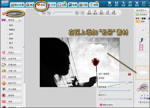 2、在“饰品”界面下,从非主流印的素材库中找一个云朵的素材,将其添加在花的上面。