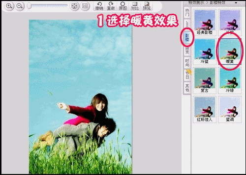 2、由于原图的色彩不够梦幻,要先利用图片效果处理一下,在“影楼”特效下,选择“暖黄”、“红粉佳人”及其“复古”效果,因为软件效果很多,可以适当地选择多种效果的叠加,会产生很好的图片效果哦。