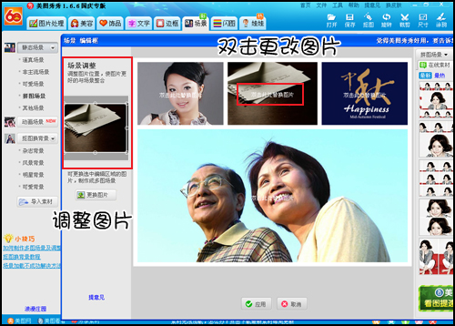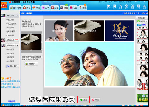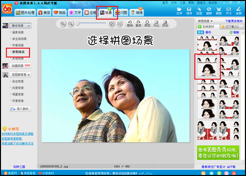 制作方法非常简单,用美图秀秀打开照片后选择“场景”——“拼图场景”,在场景编辑框选择自己喜欢的场景双击更改图片,然后调整图片,满意后选择“应用”就完成了。