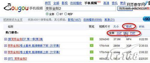 当我们输入相应关键字来查找手机视频后,可以看到如图3所示窗口,还能选择相应的格式,如MP4、3GP、PMP等,进一步细化,以便找到适合自己手机的视频。