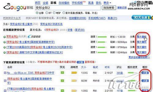 随着带宽的提升和技术的升级,迅雷狗狗可以提供网络视频的直接播放功能─全网点播,而且还提供了BT电影子集选择功能。打开迅雷狗狗的首页http://www.gougou.com,输入电影关键词,之后可以看到如图4所示的界面。