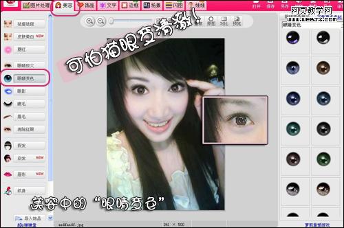 该死的反光弄得我的眼睛跟猫眼似的好难看,幸亏美图秀秀有“瞳孔变色”功能,可怕的猫眼瞬间就变得清澈了呢!