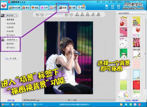 直接进入“场景”标签下,选择“抠图换背景”功能,只要在美图秀秀自带PL背景中选择一个即可。