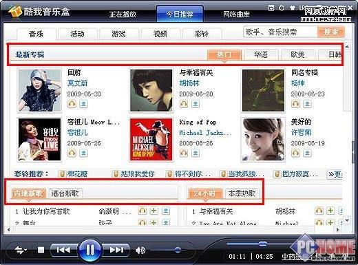 打开酷我音乐盒,切换到“今日推荐”窗口,你会看到“内地新歌”和“港台新歌”等栏目,这些栏目里就汇集了当天以及最近刚刚发布的新歌。想听哪首歌曲,只要单击对应的试听按钮即可,酷我音乐盒会自动去网上搜索该歌曲,自动播放出来,一步到位听新歌。除了今日推荐外,在“网络曲库”窗口的“榜单家族”列表里还提供了“酷我新歌榜”和“百度新歌榜”榜单,相比今日推荐的歌曲,这里提供的新歌不仅是最新的,还是最近最流行的,通过这些榜单你不仅可以第一时间听到新歌,还能够了解到时下最热闹的流行歌曲趋势等,相当不错。