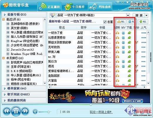 当你通过今日推荐或网络曲库找到喜欢的最新歌曲后,用右键单击该歌曲选择“播放MV”选项即可由酷我音乐盒自动去网上寻找该歌曲的MTV视频,然后自动下载播放出来。虽然是视频文件,但在线播放速度会非常快,酷我音乐盒采用的是多线程下载技术,MTV的播放速度跟在线歌曲的播放速度相差无几,一般只要几秒钟即可播放出来。可以说真正的第一时间第一速度。有些热闹的MTV视频还会提供卡拉OK伴唱功能,在播放MTV后,切换到“正在播放”窗口,在下方点击“伴唱”按钮即可自动切换到伴唱声道,此时就可以跟着伴奏演唱了。不仅能第一时间欣赏MTV,还可以第一时间演唱卡拉OK,很爽吧。