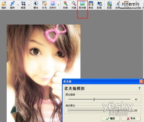 用光影魔术手打开照片,如果照片前期拍摄得不够理想,可以先做些图像处理。这里由于照片拍得已经不错,就添加了一个柔光效果,增加MM的柔美感。