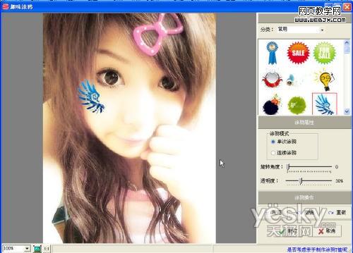 点击需要的图标,在照片上便会有显示,鼠标移动到图片上的涂鸦,可以拖动其位置以及改变大小。同时,在右边的“旋转角度、透明度”选项中,可以自动修改涂鸦的设置。如果觉得单一的涂鸦不够装饰,还可以选择“连续涂鸦”来填充多个。