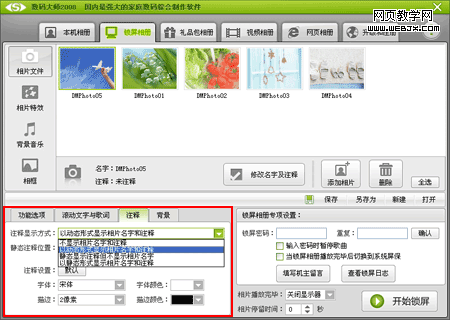 好了,基本的元素添加完毕了,但数码大师并非只提供这些简单的功能,要不就体现不出强大的一面了。我们还能干什么?我们来继续挖掘它的强大潜力!如图2,在界面的左下方可以对相册进行更多、更细的人性化强大功能设置,其分别对应“功能选项”、“滚动文字与歌词”、“注释”和“背景”,在这里你可以对各个元素进行更多样式、外观、颜色方案等细设置,比如可以对歌词、注释和背景的样式进行设置。此外,也可以控制最终演示界面的元素多少,比如我们可以在刚刚提及的“功能选项”选项卡处设置在演示界面是否允许他人通过软件集成的控制条上各个元素操作相册本身,如果允许使用控制条,还可以自定义出现在控制条上的功能选项,比如下一张相片、下一首歌、相片停留时间设置等功能的开启以否。这些都处处体现着这款王者相册软件的人性化和强大的一面!