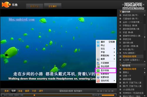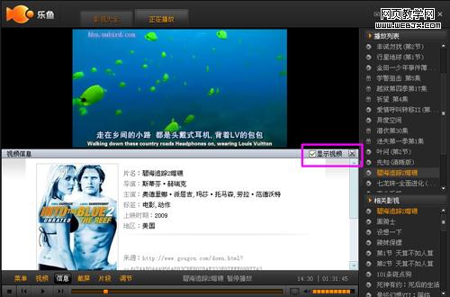 在上个版本的乐鱼中,网友只能在影视大全页面了解关于节目的诸如导演、演员、上映日期、影片介绍等详尽的信息,这样需要来回切换影视大全和视频播放两个tab页,网友会觉得影响视频观看,鉴于这一点,乐鱼在视频播放窗口增加了“显示信息”的快捷键,网友只要单击右键就可以直接调出视频信息,默认在屏幕的二分之一处显示,您可以通过视频信息页面右上方有“显示视频”控制按钮,控制视频信息的显示面积,也可以直接关闭该页面。效果如下图: