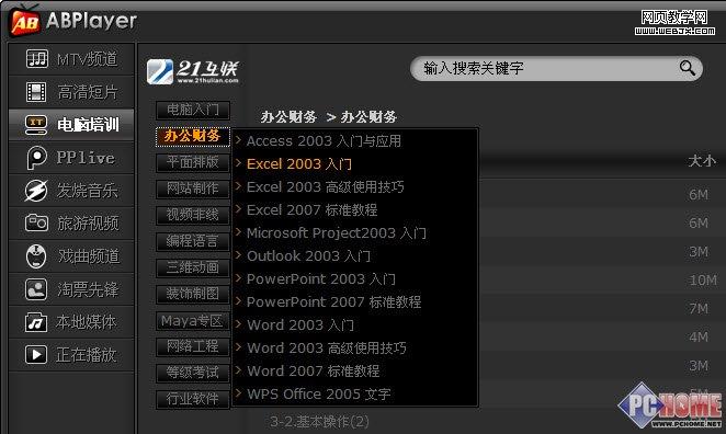 如图01所示,我们看到ABPlayer的“电脑培训”频道共包含电脑入门、办公财务、平面排版、网站制作、视频非线、编程语言、三维动画、装饰制图、Maya专区、网络工程、等级考试、行业软件等十余个专区。每个专区下,都用相应的多套教程。如笔者看得最多的就是“办公理财”类的教程。现在笔者不管是想学习Excel还是PowerPoint,只要点击几下鼠标,ABPlayer就会将相应的教程下载到电脑中,再也不用到网上四处搜索了。